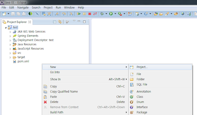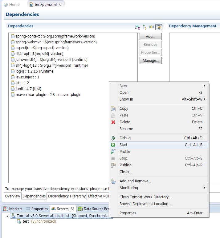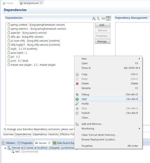 프로젝트 상에 있는 가장 아래에 있는 파일인 pom.xml 을 엽니다. 물론 서버 종료하고.. 빨간버튼 아시죠? 이거 모르면 이클립스..다시배워요..