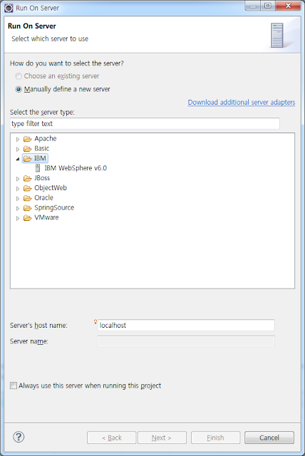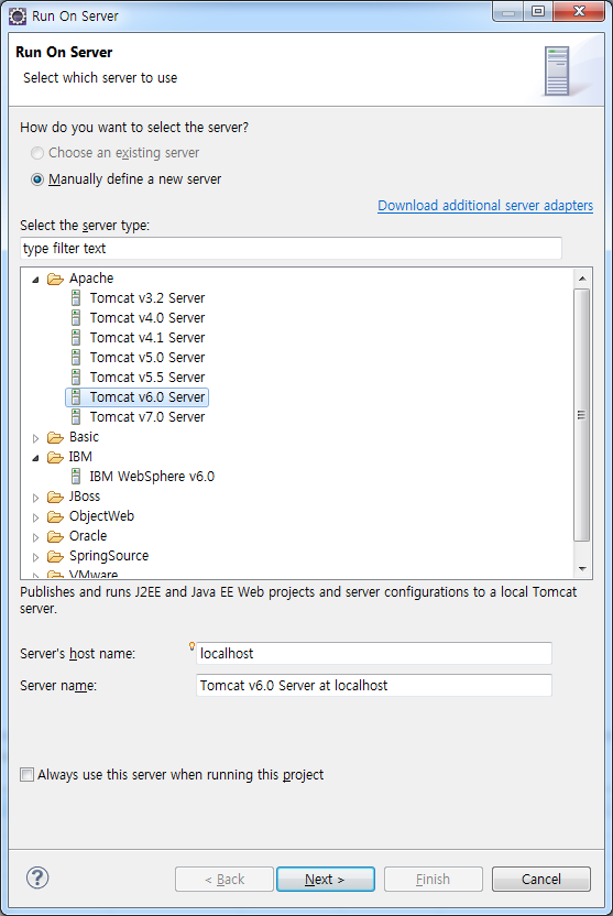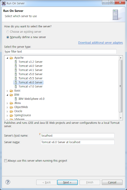 자 톰캣 6.0 선택하고 서버명과 호스트이름따위 알아서 하셈요 난 그대로 해요