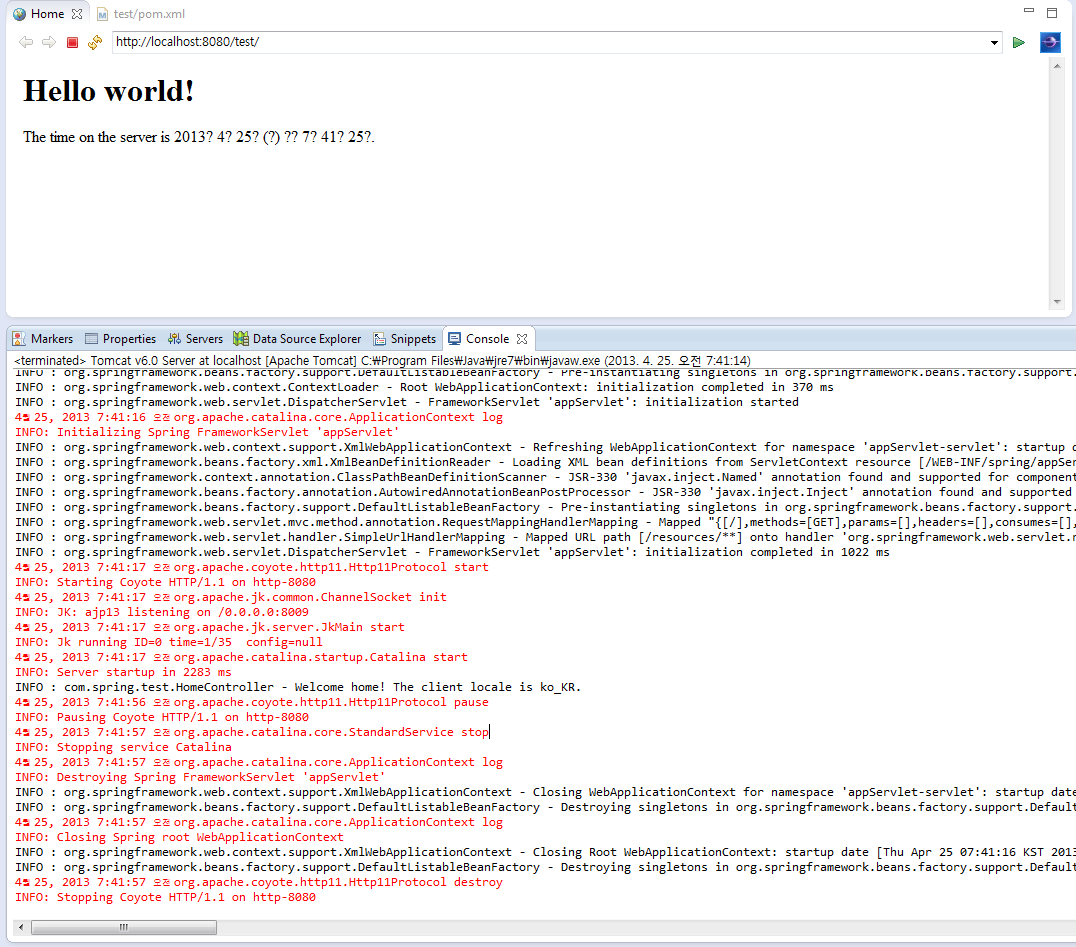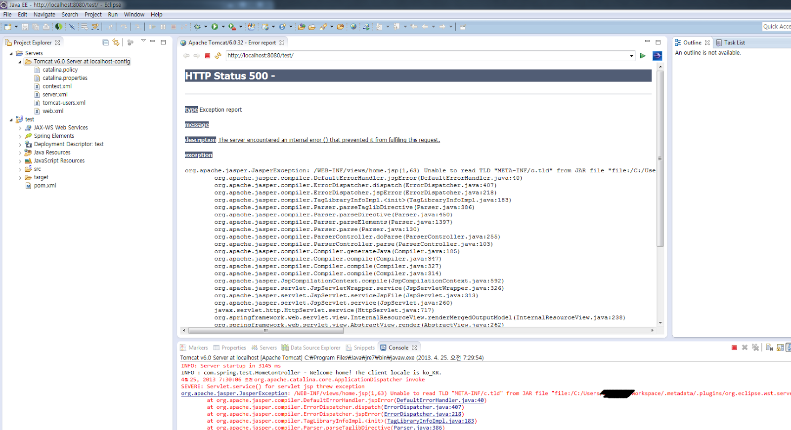 이제 실행하니 콘솔상에 에러도 없고 home.jsp 가 프로젝트 기본 jsp파일인데 내용까지 나타납니다.