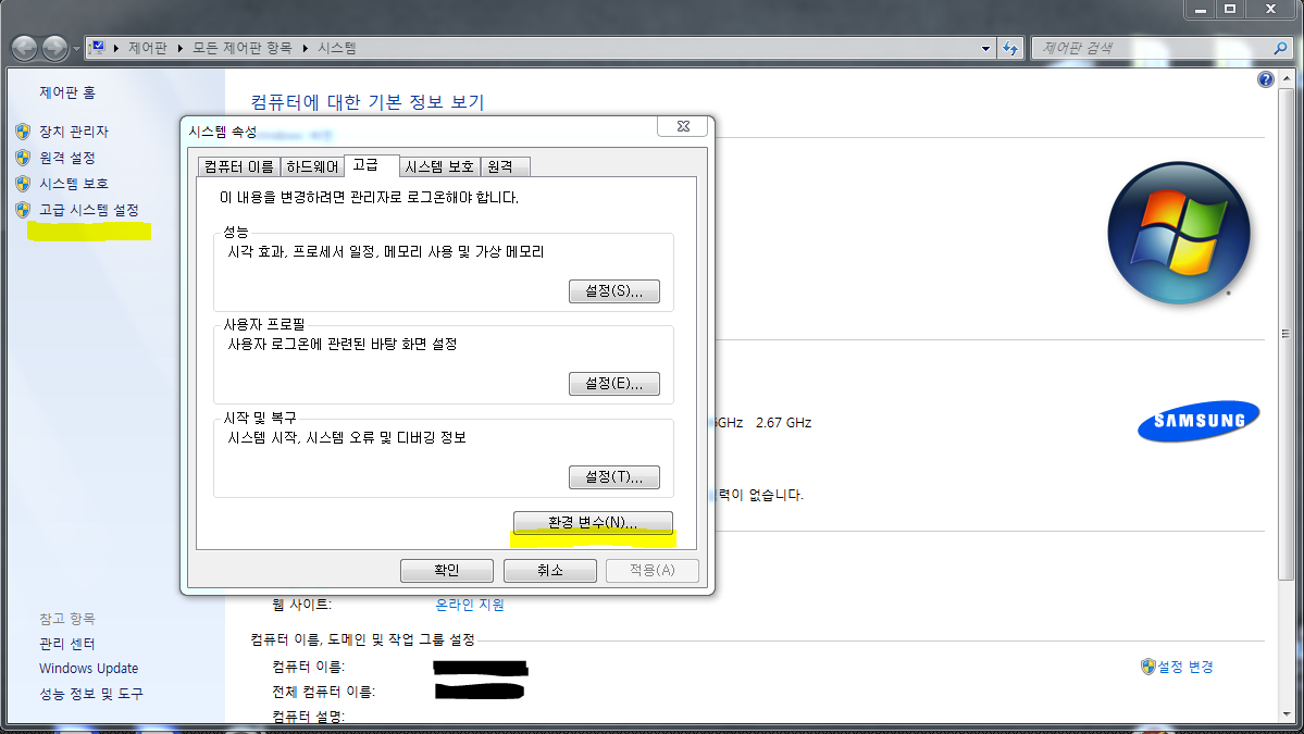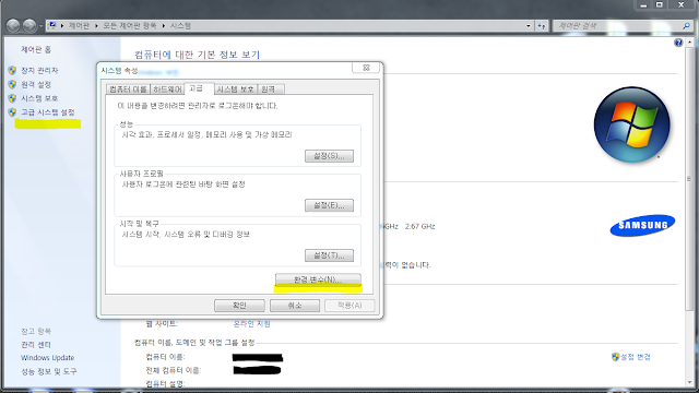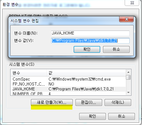 내컴퓨터 -> 속성 ->고급 시스템 설정 -> 환경변수