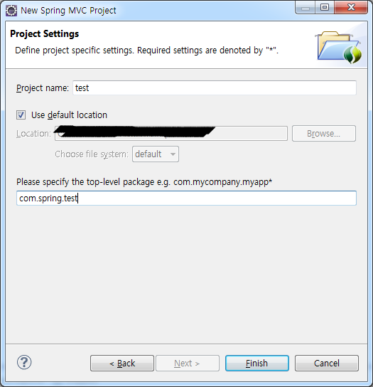 프로젝트 명과 가장 상위의 패키지 명을 적고 완료!