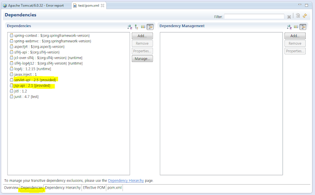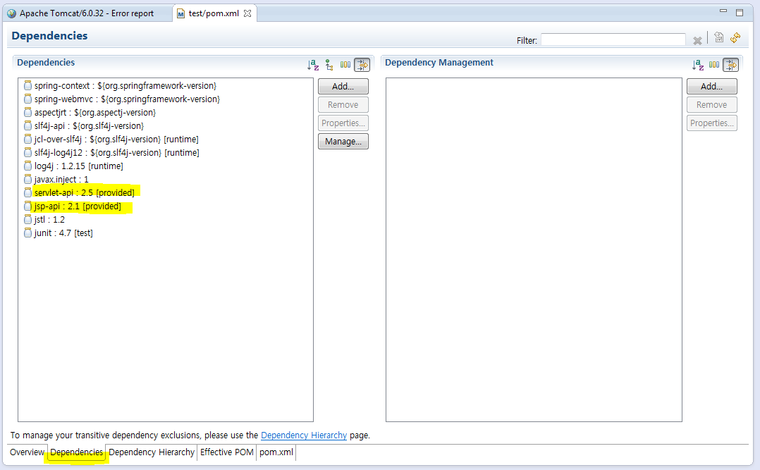 maven 에서 제공하는 jsp 관련 라이브러리와 spring에서 제공하는 라이브러리의 충돌로
